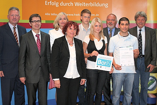Auszeichnung für herausragende Leistungen bei der Berufsvorbereitung V.l.: Dr. Andreas Weber, Leiter des Bereichs Bildung der Landesstiftung, Birgitta Winzenried, BORS-Beauftragte der Realschule Eberbach, Rektorin Regine Sattler-Streitberg, das BORS-Team: Philipp Reinhard, Jennifer Metz und Hamid Madensoy, Jury-Mitglied Jürgen Ostrowski und Günter Wiedemer, Stellvertreter des Bürgermeisters. (Foto: privat)(bro) (ls) Die Landesstiftung Baden-Württemberg zeichnet zusammen mit ihren Partnern Schulen mit dem Siegel aus, die ihre Schüler in besonderer Weise bei der Wahl eines Berufs oder Studiums unterstützen. Im Rahmen einer Feierstunde in der Handwerkskammer in Mannheim erhielten am Montag elf Schulen aus der Region Rhein-Neckar-Odenwald, darunter auch die Realschule Eberbach, das Berufswahl-Siegel der Landesstiftung Baden-Württemberg. Musikalisch wurde diese Veranstaltung durch die Bläserklasse der Realschule Eberbach umrahmt.