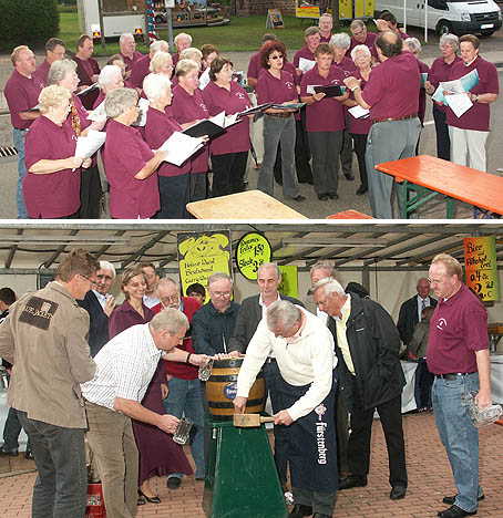Drei Tage wird jetzt gefeiert Gestern wurde das 26. Weisbacher Brunnenfest mit dem Fassanstich durch Waldbrunns Bürgermeister Klaus Schölch und vielen Ehrengästen offiziell eröffnet. Der Gemischte Chor umrahmte mit Liedbeiträgen die Eröffnung. (Fotos: Thomas Baumgartner)(tb) Mit Böllerschüssen und Liedvorträgen des Gemischten Chores von Weisbach unter der Leitung von Karl Kerber wurde gestern das 26. Weisbacher Brunnenfest eröffnet. Nachdem die Wetterprognosen nicht gerade das beste Wetter vorausgesagt hatten, wurde in diesem Jahr zusätzlich ein Festzelt aufgebaut, damit die Besucher nicht nass werden konnten. Pünktlich zum Start des Festes gab es zwar dann etwas Sonnenschein, aus drohenden Regenwolken aber auch ein paar Regentropfen, als Ortsvorsteher Reinhard Kessler unter den vielen Gästen auch den Schirmherren Bürgermeister Klaus Schölch, MdL Georg Nelius, die Ehrenbürger Gerhard Hauck und Gerd Mosca, die Kreisräte Norbert Bienek, Herbert Münkel Ralf Schnörr, sowie die Kandidatin für den Bundestag, Gabriele Teichmann begrüßen konnte. In seiner kurzen Ansprache dankte der Ortsvorsteher den Weisbacher Vereinen für ihr Engagement und die zusammen mit dem Ortschaftsrat durchgeführte Organisation des Brunnenfestes. Nachdem sich der Kessler beim Team von der Scheunenparty für die sehr gute Ausführung des ersten Teiles des Brunnenfestes bedankte hatte, gab er abschließend einen kurzen Überblick auf das Festprogramm.