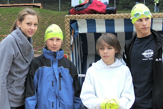 Das Wetter war kühl und nass, dennoch hatten sich ca. 150 Kinder eingefunden. Auch Nicole und Markus Wunder, Sören Braner und Michael Kreß vom SV Neptun Waldbrunn waren gekommen und schlugen sich bei ihrem ersten Triathlon wacker. Alle wollten sie so schnell wie möglich ins Ziel kommen und gaben auf ihren jeweiligen Strecken alles. Im Ziel war ihnen nicht nur der Applaus der anwesenden Zuschauer sicher, sie bekamen auch noch eine Urkunde mit einem Triathlonabzeichen, das sie stolz mit nach Hause nehmen konnten.