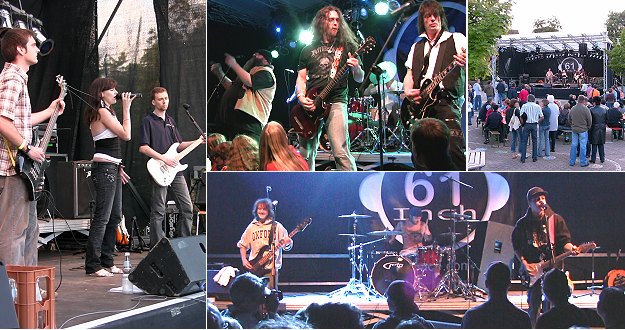 Mit Silence kam der Gewitterguss "Comix" (l.), "Die Chefs" (oben M.) und "61inch" (unten) rockten den Schönbrunner Schulhof. (Fotos: Hubert Richter)(hr) Mit einem Rockfestival läutete die Gemeinde Schönbrunn gestern Abend ihre Gewerbe- und Kulturtage "Lebendiges Schönbrunn" ein, die heute eröffnet wurden.