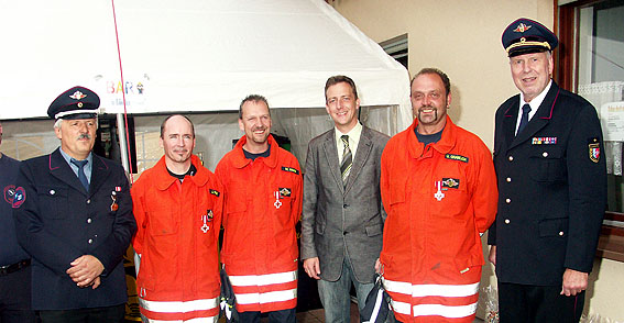 Tag der offenen Tür bei der Abteilungswehr Neckargerach Bei der Abteilungswehr Neckargerach wurden drei Wehrmänner für langjährige aktive Dienstzeit geehrt. Unser Foto zeigt von von links: Gesamtkommandant Trudpert Link, Joachim Fuchs, Werner Haas, Bürgermeister Ralf Schnörr, Uwe Gramlich und Kreisbrandmeister Rainer Dietz. (Foto: Thomas Baumgartner)