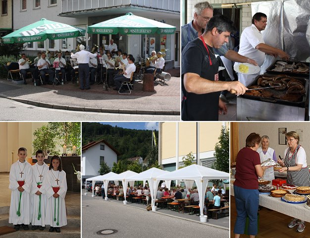 Strahlender Sonnenschein über St.Josef O.l.: Die Pfarrkapelle unter Leitung von Gustav Rumstadt sorgte mit ihrer Musik für gute Stimmung unter den Besucherinnen und Besuchern des Pfarrfestes.; o.r.: Die „Grillmeister“ bei der Arbeit.; u.l.: Die drei neuen Ministrantinnen und Ministranten Mario Lux, Manuel und Franziska Dietz.; u.m.: Die zahlreichen Besucher auf dem Parkplatz der Kirche St.Josef.; u.r.: Auch für Kuchen war reichlich gesorgt. (Fotos: Mauritius Schell)(mts) Mit einem zahlreich besuchten Familiengottesdienst startete heute das diesjährige Pfarrfest in der Pfarrgemeinde St. Josef in Eberbach-Nord.