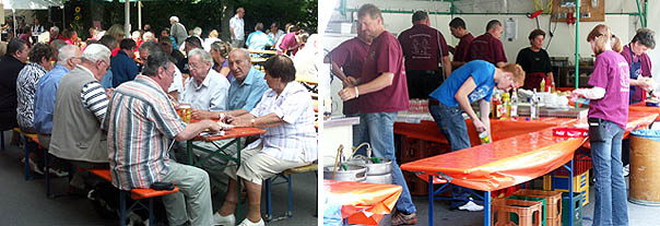 Musikfest der Feuerwehrkapelle Waldkatzenbach Gut besucht war auch in diesem Jahr das Musikfest der Feuerwehrkapelle Waldkatzenbach. Alle Hände voll zu tun hatten die Helfer hinter der Theke. (Fotos: Thomas Baumgartner)(tb) Einen besonderen Draht zum Wettergott hat wohl die Feuerwehrkapelle Waldkatzenbach, denn pünktlich zu ihrem diesjährigen Musikfest unter den Linden kehrte der Sommer in den Odenwald zurück. So feierte am Sonntag bei bestem Sonnenschein und nach langer Zeit wieder angenehmen Sommertemperaturen die über die Waldbrunner Gemeindegrenzen bekannte Feuerwehrkapelle Waldkatzenbach ihr traditionelles Musikfest. Gefeiert wurde dabei direkt am Fuße des Katzenbuckels unter den Linden im Hof des Bürgersaals von Waldkatzenbach. Wie in den vergangenen Jahren auch, stand das Fest ganz im Zeichen der Blasmusik. Wie immer war es dabei dem Veranstalter gelungen, hervorragende Blaskapellen für einen Auftritt in Waldkatzenbach zu gewinnen. Insgesamt drei Blaskapellen musizierten dabei unter den Linden. Morgens begann man nach den Gottesdiensten mit einem zünftigen Frühschoppen, der von der Blaskapelle Gammelsbach umrahmt wurde. Traditionell war danach für das leibliche Wohl beim gemeinsamen Mittagessen bestens gesorgt. Gut eingespielt war dabei auch das Team hinter der Theke das in den Mittagsstunden alle Hände voll zu tun hatten. In den Mittagsstunden gab es dann auch Kaffee und Kuchen und die zahlreichen Besucher wurden von der ZKG Ziegelhausen unterhalten. Den musikalischen Schlusspunkt am Abend setzten dann Neckargeracher Musikanten.