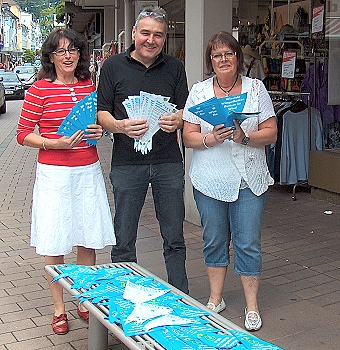 Glückliche Gewinner gezogen Die Ziehung der Gewinner erfolgte unter dem EWG-Team: Regina Bier, Rolf Wieprecht und Renate Konradi unter den flatternden Wimpelketten (v.l.). (Foto: privat)(bro) (rw) Die Eberbacher Werbegemeinschaft hat im Rahmen ihres Sommerstraßenfestes, das am Freitag, 3. Juli, für Sommerstimmung und entspanntes Einkaufsvergnügen sorgte, ein EWG-Wimpel-Preisausschreiben veranstaltet.