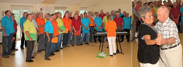 MGV Liederkranz sorgte für Kurzweil im Seniorenstift LInks: Mit ihren leuchtenden Hemden im Stil der Siebziger boten die Sänger des MGV Liederkranz mit ihrer Chorleiterin Karin Conrath nicht nur einen bunten Melodienstrauß, sondern auch ein farbenfrohes Bild. Rechts: Mit bekannten Schlagern regten die Sänger sogar dazu an, das Tanzbein zu schwingen. (Fotos: privat)(bro) (ah) Mit einigen Ausschnitten aus seinem Konzertprogramm "Zurück in die 70er" sowie einem Weinlieder-Potpourri sorgte der MGV Liederkranz Eberbach bei seinem kleinen Konzert für die Bewohner des Seniorenstiftes in Rockenau für kurzweilige Unterhaltung.