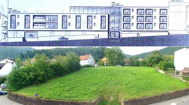 Grünes Licht für Johannes-Anstalten Oben eine skizzierte Ansicht des Projekts von der Alten Dielbacher Straße, unten das derzeit noch unbebaute Grundstück. (Repro: Hubert Richter / Foto: Archiv)(hr) Zum zweiten Mal innerhalb von 14 Tagen hatte sich der Bau- und Umweltausschuss des Eberbacher Gemeinderats am vergangenen Donnerstag mit der Bauvoranfrage für ein Wohn- und Pflegeheim in der Alten Dielbacher Straße zu befassen.