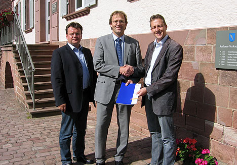 EnBW einziger Bewerber Bürgermeister Ralf Schnörr (r.) und Frank Schupp (Mitte), Leiter Netzkundenbetreuung der EnBW, unterzeichneten den neuen Konzessionsvertrag. (Foto: GVN) (hof) Der Gemeinderat Neckargerach bestätigte dieser Tage die Arbeit der EnBW Regional AG. In Sachen Stromversorgung bleiben die Gemeinde und die EnBW Regional AG weiter Partner. Bürgermeister Ralf Schnörr und Frank Schupp, Leiter Netzkundenbetreuung des EnBW Regionalzentrums Neckar-Franken, unterzeichneten gemeinsam den neuen Stromkonzessionsvertrag. Dieser tritt zum 01. Januar 2011 in Kraft und gilt für die nächsten zwanzig Jahre. Im Gegensatz zu anderen Gemeinden im Neckar-Odenwald-Kreis gab es in der Neckartalgemeinde neben dem Stromkonzern keine weiteren Bewerber.