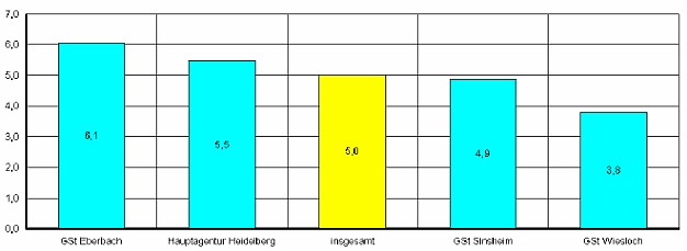 Im Bereich der Geschäftsstelle Eberbach ist die Arbeitslosenzahl im Juli um 10 auf 578 gestiegen. Im Vergleich zum Vorjahr gab es 177 Arbeitslose mehr. Die Arbeitslosenquote, berechnet auf der Basis aller zivilen Erwerbspersonen, betrug im Juli 6,1 Prozent (Juni 5,9 Prozent). Vor einem Jahr hatte sich die Quote auf 4,2 Prozent belaufen.