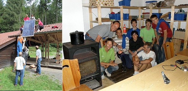 Solarstrom für das Waldklassenzimmer (Fotos: privat)(bro) (hg) Wer bisher im Eberbacher Waldklassenzimmer das Licht anknipsen wollte, suchte den Lichtschalter vergeblich. Die tief im Gretengrund verborgene Waldhütte verfügt natürlich über keinen Stromanschluss. Bei der Gründung des Waldklassenzimmers baute man deshalb Gasleuchten ein, die sich aber in der Praxis als umständlich und nicht ungefährlich erwiesen. Deshalb plante der Verein "Waldklassenzimmer" mit seinem Vorsitzenden Dr. Peter Sack schon seit einiger Zeit den Einbau einer Solaranlage zur Stromversorgung der Hütte. Doch die vorhandenen finanziellen Mittel reichten zwar für die Bauteile der Anlage, nicht aber für die Installation durch eine professionelle Firma.