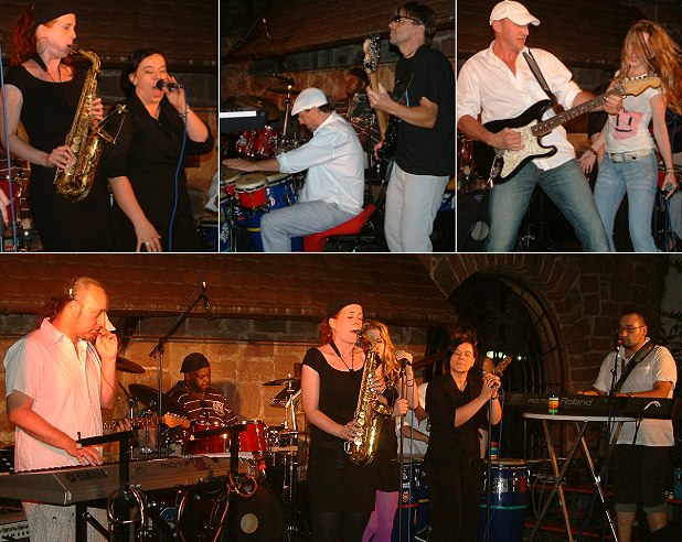 Us2U begeisterten einmal mehr das Eberbacher Publikum Linkes Bild: Saxophonistin Michelle Labonte und Sängerin Indra Wahl waren am Freitag als Gäste bei "Us2U" dabei. Oben Mitte: An der Percussion Karl Kempf, Jay Jackson am Schlagzeug im Hintergrund und am Bass Carsten Reiter. Oben rechts: Lokalmatador Johannes Solf an der Gitarre mit Sängerin Raluca Mihaela. Bild unten: Links am Keyboard Thorsten Kaffenberger und rechts Keyboarder und Sänger Dario Allegra. (Fotos:Wörner)(tw) Mit "Mission Impossible", dem imposanten Soundtrack aus dem gleichnamigen Film mit Tom Cruise begannen "Us2U" am Freitag den Abend im Pulverturmhof. Aber als so unmöglich erwies sich der Auftrag dann doch nicht. Langsam füllten sich die anfänglich etwas lichten Reihen an Eberbachs vielleicht schönstem Veranstaltungsort. Ganz allmählich kam dann auch das Publikum in "Schwung" und ließ sich von den gutgelaunten Musikern und einer abwechslungsreichen Mischung aus Funk, Pop, Rock und ein bisschen Reggae mitreißen. Nach der Pause waren die Zuhörer wie ausgewechselt. Ohne erneute Aufwärmphase war Party am Pulverturm. Wegen der Polizeiverordnung musste die Veranstaltung um 23 Uhr für die meisten viel zu früh enden, aber nicht ohne eine lautstark geforderte Zugabe von Us2U.