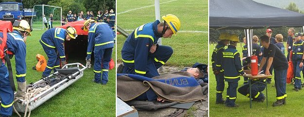 Hier galt es beispielsweise die Handhabung verschiedener Werkzeuge zu erklären, das Ablängen (absägen) einer Gewindestange mit einer Metallbügelsäge vorzuführen oder das Herstellen einer Schocklage zu demonstrieren. Bei der Teamprüfung wurde ein Unglücksfall simuliert. Hier musste eine verletzte Person mit Hilfe eines Schleifkorbes aus einer Höhle gerettet werden. Ruhe und Besonnenheit waren hier besonders wichtig, aber trotzdem musste jeder noch so kleine Handgriff exakt ausgeführt werden.