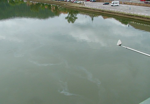 Eimer mit Öl bei Zwingenberg in den Neckar gekippt Deutlich sichtbar war die Ölverschmutzung von der Eberbacher Neckarbrücke. (Foto: Hubert Richter)(hr) Ein ausgedehnter Ölfilm trieb am vergangenen Sonntag auf dem Neckar in Richtung Heidelberg.
