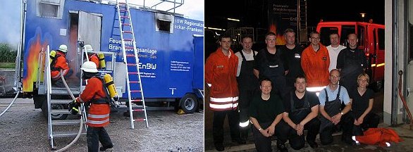 Eberbacher Feuerwehr trainierte im Brandübungscontainer links: Brandbekänpfung im Brandübungscontainer; rechts: Unterkreisführerin Stefanie Heck (1.v.li. kniend) mit den Eberbacher Feuerwehrkameraden (Foto: privat)(ko) Anlässlich der Gewerbe- und Kulturtage in Schönbrunn am letzten Wochenende im Juli stellte die EnBw ihren Brandübungscontainer der Gemeinde Schönbrunn zur Verfügung. Die Feuerwehr Schönbrunn lud zum Üben in diesem Container auch ihre Nachbarwehr aus Eberbach ein, die an zwei Tagen mit 30 Kameraden der Abteilung Stadt und den dazugehörigen Ortsteilen dieser Einladung gerne nachkam.