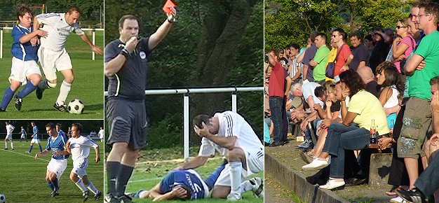 Schwacher Rundenauftakt in der B-Klasse Zweikampfszenen, daneben ein Platzverweis kurz vor Spielende: Zwei halten sich den Kopf, einer davon (Cancar, knieend) sieht rot. Rechts ein Blick ins Publikum. (Fotos: Hubert Richter)(hr) Ein enttäuschendes Lokalderby zum Rundenauftakt in der B-Klasse des Fußballkreises Heidelberg lieferten sich heute in der Au der VfB Eberbach und die SG Rockenau.