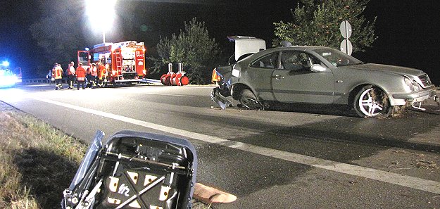 Ein 35-jähriger Autofahrer aus dem Neckar-Odenwald-Kreis hatte bei stark überhöhter Geschwindigkeit die Kontrolle über sein Fahrzeug verloren, die Gegenfahrbahn überquert und war links die Böschung hochgefahren. Der silbergraue Mercedes CLK 320 wurde dann wieder auf die Fahrbahn zurück geschleudert und blieb dort mit Totalschaden entgegen der Fahrtrichtung liegen.