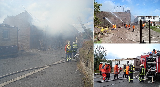 Durch die in der Scheune gelagerten Heuballen brannte das Gebäude lichterloh. Kurz nach Eintreffen der ersten Feuerwehrkräfte stürzte der Dachvorsprung der Scheune auf die Straße. Ein Giebel drohte auf ein benachbartes Gebäude zu fallen. Er wurde im Laufe des Einsatzes mithilfe eines Baggers und eines Forstschleppers kontrolliert abgetragen. Heu wurde aus der Scheune gebracht und auf eine Wiese zum Nachlöschen tranportiert. Um alle Brandnester zu erreichen, musste das Gebäude während der Löscharbeiten bis auf die Grundmauern abgetragen werden. Auch landwirtschaftliche Geräte in der Scheune wurden zerstört.