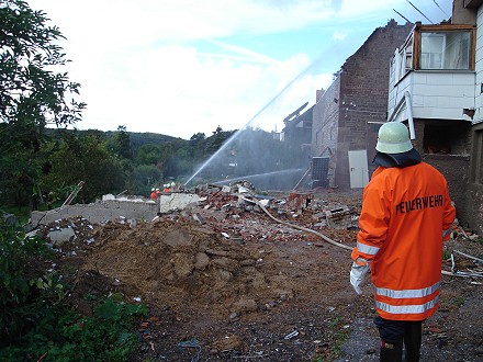 Durch die in der Scheune gelagerten Heuballen brannte das Gebäude lichterloh. Kurz nach Eintreffen der ersten Feuerwehrkräfte stürzte der Dachvorsprung der Scheune auf die Straße. Ein Giebel drohte auf ein benachbartes Gebäude zu fallen. Er wurde im Laufe des Einsatzes mithilfe eines Baggers und eines Forstschleppers kontrolliert abgetragen. Heu wurde aus der Scheune gebracht und auf eine Wiese zum Nachlöschen tranportiert. Um alle Brandnester zu erreichen, musste das Gebäude während der Löscharbeiten bis auf die Grundmauern abgetragen werden. Auch landwirtschaftliche Geräte in der Scheune wurden zerstört.