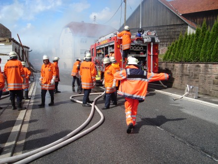 Durch die in der Scheune gelagerten Heuballen brannte das Gebäude lichterloh. Kurz nach Eintreffen der ersten Feuerwehrkräfte stürzte der Dachvorsprung der Scheune auf die Straße. Ein Giebel drohte auf ein benachbartes Gebäude zu fallen. Er wurde im Laufe des Einsatzes mithilfe eines Baggers und eines Forstschleppers kontrolliert abgetragen. Heu wurde aus der Scheune gebracht und auf eine Wiese zum Nachlöschen tranportiert. Um alle Brandnester zu erreichen, musste das Gebäude während der Löscharbeiten bis auf die Grundmauern abgetragen werden. Auch landwirtschaftliche Geräte in der Scheune wurden zerstört.
