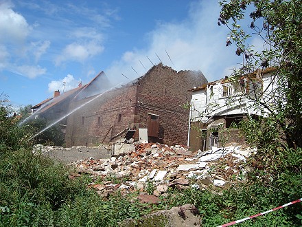 Durch die in der Scheune gelagerten Heuballen brannte das Gebäude lichterloh. Kurz nach Eintreffen der ersten Feuerwehrkräfte stürzte der Dachvorsprung der Scheune auf die Straße. Ein Giebel drohte auf ein benachbartes Gebäude zu fallen. Er wurde im Laufe des Einsatzes mithilfe eines Baggers und eines Forstschleppers kontrolliert abgetragen. Heu wurde aus der Scheune gebracht und auf eine Wiese zum Nachlöschen tranportiert. Um alle Brandnester zu erreichen, musste das Gebäude während der Löscharbeiten bis auf die Grundmauern abgetragen werden. Auch landwirtschaftliche Geräte in der Scheune wurden zerstört.