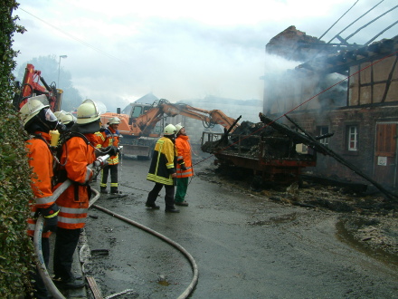 Durch die in der Scheune gelagerten Heuballen brannte das Gebäude lichterloh. Kurz nach Eintreffen der ersten Feuerwehrkräfte stürzte der Dachvorsprung der Scheune auf die Straße. Ein Giebel drohte auf ein benachbartes Gebäude zu fallen. Er wurde im Laufe des Einsatzes mithilfe eines Baggers und eines Forstschleppers kontrolliert abgetragen. Heu wurde aus der Scheune gebracht und auf eine Wiese zum Nachlöschen tranportiert. Um alle Brandnester zu erreichen, musste das Gebäude während der Löscharbeiten bis auf die Grundmauern abgetragen werden. Auch landwirtschaftliche Geräte in der Scheune wurden zerstört.