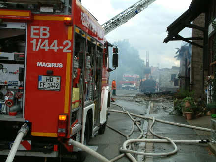 Zum Startbild (hr) Beim Brand einer Scheune im Eberbacher Ortsteil Unterdielbach entstand heute Mittag Sachschaden von mindestens 250.000 Euro. Fast 100 Feuerwehrleute aus Eberbach und Waldbrunn waren im Einsatz. Die Löscharbeiten dauerten bis zum Abend an. Ein Feuerwehrmann wurde leicht verletzt.