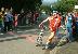 Die Staffelteilnehmer übergaben hier an ihre "Radspezialisten". Für die Einzelstarter hieß es umziehen und unter den Anfeuerungsrufen der Zuschauer ab auf die anspruchsvolle Radstrecke. 21 Kilometer, zuerst nach Pleutersbach, dann nach Allemühl, Schönbrunn und zum Wendepunkt am Ortseingang Schwanheim. Von dort den gleichen Weg wieder zurück.