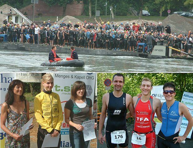 Kurz vor 9 Uhr heute Morgen wurden die Teilnehmer/innen des Jedermann- und Sprinttriathlons auf einem Ponton des Wasser- und Schifffahrtsamtes zum Startpunkt beim Kanuhaus gebracht. Dort ging es in den mit 19,2 Grad "wohltemperierten" Neckar, zu dem Zeitpunkt wärmer als die Lufttemperatur. Die Wassertemperatur wurde von einem Kampfrichter durch mehrere Messungen festgestellt und das Tragen eines Neopren- Anzuges gestattet. Der Start vom Schwimmponton, immer eine etwas knifflige Sache, ging dieses Jahr reibungslos vonstatten. Nach 700 Metern verließen die Schwimmer an der Bootsschleppe des DLRG das Wasser und rannten zur Wechselzone vor dem Hallenbad.