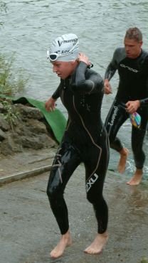 Kurz vor 9 Uhr heute Morgen wurden die Teilnehmer/innen des Jedermann- und Sprinttriathlons auf einem Ponton des Wasser- und Schifffahrtsamtes zum Startpunkt beim Kanuhaus gebracht. Dort ging es in den mit 19,2 Grad "wohltemperierten" Neckar, zu dem Zeitpunkt wärmer als die Lufttemperatur. Die Wassertemperatur wurde von einem Kampfrichter durch mehrere Messungen festgestellt und das Tragen eines Neopren- Anzuges gestattet. Der Start vom Schwimmponton, immer eine etwas knifflige Sache, ging dieses Jahr reibungslos vonstatten. Nach 700 Metern verließen die Schwimmer an der Bootsschleppe des DLRG das Wasser und rannten zur Wechselzone vor dem Hallenbad.
