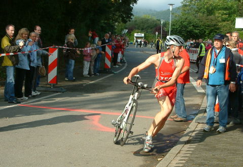 Die Staffelteilnehmer übergaben hier an ihre "Radspezialisten". Für die Einzelstarter hieß es umziehen und unter den Anfeuerungsrufen der Zuschauer ab auf die anspruchsvolle Radstrecke. 21 Kilometer, zuerst nach Pleutersbach, dann nach Allemühl, Schönbrunn und zum Wendepunkt am Ortseingang Schwanheim. Von dort den gleichen Weg wieder zurück.