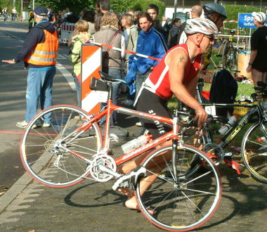 Die Staffelteilnehmer übergaben hier an ihre "Radspezialisten". Für die Einzelstarter hieß es umziehen und unter den Anfeuerungsrufen der Zuschauer ab auf die anspruchsvolle Radstrecke. 21 Kilometer, zuerst nach Pleutersbach, dann nach Allemühl, Schönbrunn und zum Wendepunkt am Ortseingang Schwanheim. Von dort den gleichen Weg wieder zurück.