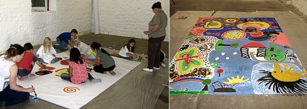 Die Geschichte von Roderich kam bei den Kindern gut an. Sie hörten aufmerksam zu und diskutierten über die kleinen Abenteuer, die Roderich erlebte. Dann ging es zum kreativen Teil des Nachmittags über - das Malen. Die Kinder waren von Roderich so beeindruckt, dass sie Roderichs Abenteuer auf dem riesigen Stück Papier nachmalten und auch neue Abenteuer für ihn erfanden. Ziel war es, dass man keinen weißen Flecken mehr sehen konnte. Und das wurde auch erreicht. Am Ende entstand ein buntes Bild mit Stachelschweinen, Kirschbäumen, Kuscheltieren, eine Bademütze und einem Monster.