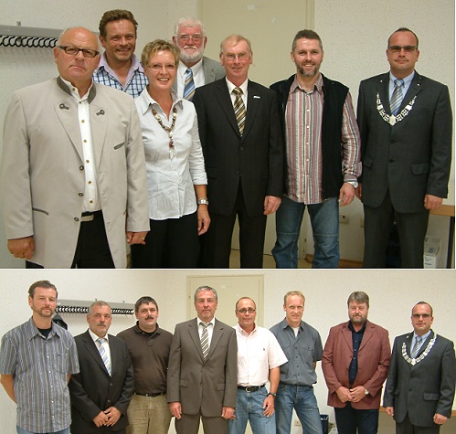 Scheidende Schönbrunner Ratsmitglieder wurden gebührend verabschiedet Bürgermeister Jan Frey (r.) mit den ausscheidenden Gemeinderatsmitgliedern (v.l.) Adolf Kress (war insgesamt 15 Jahre im Gemeinderat), Carsten Schuppenhauer (14 Monate), Christiane Lindenbach (10 Jahre), Gerhard Göhrig (22 Jahre), Berthold Göhrig (20 Jahre) und Jörg Mützel (7 Jahre), nicht auf dem Bild ist Ralf Heckmann (10 Jahre). Auf dem unteren Bild die Neuen im Gemeinderat von Schönbrunn: (v.l.) Sascha Babovic, Jürgen Bayer, Philipp Danzeisen, Jürgen Dinkeldein, Rüdiger Fabrie, Torsten Martin, Volker Wesch und Bürgermeister Frey. (Fotos:Wörner)(tw) In der öffentlichen Gemeinderatssitzung im Bürgersaal des Schönbrunner Rathauses wurden gestern Abend sieben ausscheidende Ratsmitglieder von Bürgermeister Jan Frey verabschiedet und die bei den Kommunalwahlen am 7. Juni gewählten Gemeinderäte verpflichtet.