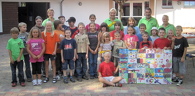 Bei schönem Wetter führte eine große Wildpark-Rallye die Kinder in Gruppen durch den ganzen Park. Es galt, viele Fragen zu beantworten und so manche knifflige Aufgabe zu lösen. Selbst gesammelte Naturmaterialien konnten später zum kreativen Basteln genutzt werden. Nach der Rallye durch den Park wurde im Birkenhof nach Herzenslust gebastelt und gewerkelt. Es entstanden wahre Kunstwerke für Mama, Oma oder Schwester. Der Mit-Initiator des Nistkastenprojektes Klaus Weigel stellte den Kindern die Besonderheiten der einzelnen Nistkästen vor und berichtete Interessantes und Informatives über die unterschiedlichen Vogelarten wie Meise, Star, Amsel, Kleiber und Co. Auf einer Leinwand verewigten sich alle Ferienkinder mit Fingerfarben in einem individuell gestalteten Bildabschnitt und ließen so ein kunterbuntes und fröhliches Kunstwerk entstehen. Nach so viel körperlicher und geistiger Anstrengung wurden die leckeren Pizzabrötchen zur Stärkung gerne angenommen. Anschließend beendete eine gemeinsame Fahrt mit der Eisenbahn einen erlebnisreichen und kreativen Nachmittag im Wildpark Schwarzach. Der Wildpark-Förderverein freut sich auf ein Wiedersehen im nächsten Sommer.