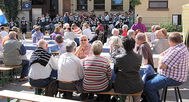 Flotte Musik bei schönem Spätsommerwetter (Foto: Marcus Deschner)(bro) (md) Zum Sommerfest hatte der Fanfarenzug der Stadt Eberbach am Sonntag, 13. September, in den Hof der Dr.-Weiß-Schule geladen. Und zahlreiche Gäste kamen und ließen sich bei Bier, Cola und Bratwurst von flotter Musik unterhalten.