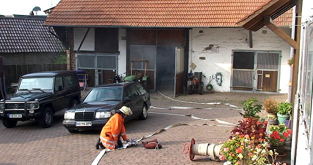 Beteiligt waren alle fünf Ortsteilwehren sowie das DRK Schönbrunn. Ausgangslage der Übung war ein angenommener Brand in einer Scheune mit angebautem Wohnhaus. Zunächst mussten die Helfer teils unter Atemschutz sechs Kinder "retten", die in der Scheune, in angrenzenden Pferdeboxen sowie in einem Schuppen neben dem Brandherd vermisst wurden. Die Wehrmänner übergaben die "Verletzten" dem Deutschen Roten Kreuz zur weiteren Versorgung. Sodann wurde der Löscheinsatz durchgespielt, bei dem es vor allem auf den Schutz angrenzender Anwesen und Wohngebäude ankam sowie auf Kühlung eines durch das Feuer gefährdeten Erdgastanks hinter der Scheune.