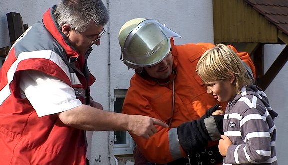 Beteiligt waren alle fünf Ortsteilwehren sowie das DRK Schönbrunn. Ausgangslage der Übung war ein angenommener Brand in einer Scheune mit angebautem Wohnhaus. Zunächst mussten die Helfer teils unter Atemschutz sechs Kinder "retten", die in der Scheune, in angrenzenden Pferdeboxen sowie in einem Schuppen neben dem Brandherd vermisst wurden. Die Wehrmänner übergaben die "Verletzten" dem Deutschen Roten Kreuz zur weiteren Versorgung. Sodann wurde der Löscheinsatz durchgespielt, bei dem es vor allem auf den Schutz angrenzender Anwesen und Wohngebäude ankam sowie auf Kühlung eines durch das Feuer gefährdeten Erdgastanks hinter der Scheune.