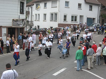 Am Sonntagnachmittag beim großen Kerwe-Umzug setzten die Pleutersbacher dann noch einen obendrauf. Von den Fußballern der Jugendmannschaft über die Fußball-Frauen bis hin zu dem Hoffenheim-Fanclub Neckar-Löwen und dem Gesangsverein war alles unterwegs was „fit“ war und zwei sportliche Beine hatte. Natürlich durfte auch der Kerwe-Pfarrer (Andreas Schäfer) mit seinen Kerwe-Borscht und der „Schlumpel“ bei diesem Event nicht fehlen. Musikalisch umrahmt wurde der Kerwe-Umzug von dem Spielmannszug aus Mannheim-Feudenheim und der Musikkapelle aus Allemühl.