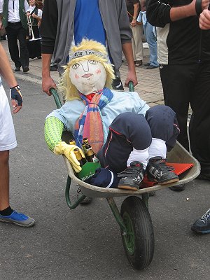 Am Sonntagnachmittag beim großen Kerwe-Umzug setzten die Pleutersbacher dann noch einen obendrauf. Von den Fußballern der Jugendmannschaft über die Fußball-Frauen bis hin zu dem Hoffenheim-Fanclub Neckar-Löwen und dem Gesangsverein war alles unterwegs was „fit“ war und zwei sportliche Beine hatte. Natürlich durfte auch der Kerwe-Pfarrer (Andreas Schäfer) mit seinen Kerwe-Borscht und der „Schlumpel“ bei diesem Event nicht fehlen. Musikalisch umrahmt wurde der Kerwe-Umzug von dem Spielmannszug aus Mannheim-Feudenheim und der Musikkapelle aus Allemühl.