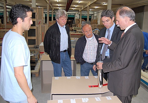 Dr. Stephan Harbarth besichtigte den Betrieb Dr. Andreas Wiese erläuterte Bundestagskandidat Dr. Stephan Harbarth, Karl Braun und Günter Wiedemer wie Tischfüße an die Glasplatte "geklebt" werden. (Foto: Marcus Deschner)(bro) (md) "Toll, was man aus einer Platte alles machen kann", staunte Dr. Stephan Harbarth. Und meinte damit die Tische, die die Firma Ronald Schmitt in vielfältigen Ausführungen herstellt. Der CDU-Bundestagskandidat weilte zur Betriebsbesichtigung im Gretengrund. Nicht spurlos sei die aktuelle Wirtschaftskrise an dem mittelständischen Unternehmen vorbei gegangen, erklärte Geschäftsführer Dr. Andreas Wiese bei der Begrüßung. Noch vor Jahren habe die Firma, die 2008 ihr 50-jähriges Bestehen feierte, einen Exportanteil von 40 Prozent gehabt. Der sei mittlerweile drastisch eingebrochen. Zu schaffen machten dem Betrieb mit 120 Mitarbeitern auch Kopien der Möbel aus Fernost. Bei der Entwicklung neuer Modelle habe man die Nase vorn. Beispielsweise mit dem ergonomisch durchdachten Tischsystem "iSUP". Die Technik der höhenverstellbaren Serie ist patentiert und zeichnet sich durch eine einfache und bequeme Bedienung aus. Nur über Wachstum könne man der momentanen Krise begegnen, gab sich Stephan Harbarth überzeugt und sprach sich strikt gegen Steuererhöhungen aus: "Die würden nur den Konsum abwürgen."