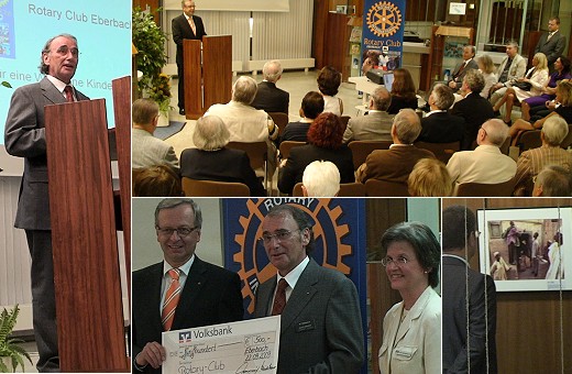 Der Kampf der Rotarier um das letzte Prozent Links Dr. Klaus Diegritz bei seinem Vortrag, oben die Begrüßung der Gäste durch Volksbank-Vorstand Ekkehard Saueressig. Unten Mitte die Scheckübergabe durch Ekkehard Saueressig (l.) und Vorstandskollegin Ulrike Winterbauer an Rotary-Präsident Diegritz. Unten rechts ein Giboux-Foto der Ausstellung im Obergeschoss der Volksbank. (Fotos: Hubert Richter)(cr) (ra) Vorgestern eröffnete der Eberbacher Arzt und Präsident des Rotary-Clubs, Dr. Klaus Diegritz, die aktuelle Ausstellung der Volksbank Neckartal zum Thema "Polio – das letzte Kapitel“. Die eindrucksvollen Fotografien von Jean Marc Giboux sind bis zum 18. Oktober im Obergeschoss der Schalterhalle zu sehen.