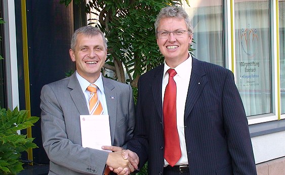 Dabei war nicht einmal Losglück im Spiel, denn Peter Wessely, selbst Mitglied des Gemeinderats, hatte als einziger Teilnehmer den richtigen Riecher. Er tippte auf die Sitzverteilung CDU 7 - SPD 6 - Freie Wähler 6 - AGL 3 und lag damit goldrichtig. Regionaldirektor Karlheinz Emig von der Sparkasse Neckartal-Odenwald (rechts im Bild) überreichte Wessely den 1. Preis des Gewinnspiels, einen Spargeschenkgutschein der Sparkasse im Wert von 220 Euro.