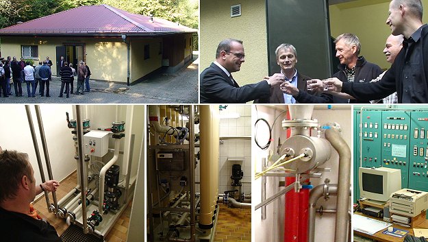 Hauptanlage der Schönbrunner Wasserversorgung wurde runderneuert O.l. das Pumpwerk in Allemühl, rechts stoßen Bürgermeister Jan Frey, der planende Ingenieur Gerhard Leiblein, Peter Engelhart vom Wasserrechtsamt des Rhein-Neckar-Kreises, Wassermeister Heinz Winterbauer und Klaus Schuler von der bauausführenden Firma (v.l.) mit einem Schnapsglas feinsten Allemühler Trinkwassers auf die neue Anlage an. Unten v.l. die chemische Reinigungsanlage, die neue Filteranlage, die neue UV-Entkeimung und die computergestützte Zentrale. (Fotos: Hubert Richter)(hr) Auf den neuesten technischen und hygienischen Stand gebracht hat die Gemeinde Schönbrunn jetzt das Herzstück ihrer Trinkwasserversorgung. Die Wasseraufbereitungsanlage mit Pumpwerk in Allemühl wurde für 437.000 Euro saniert und heute offiziell in Betrieb genommen.