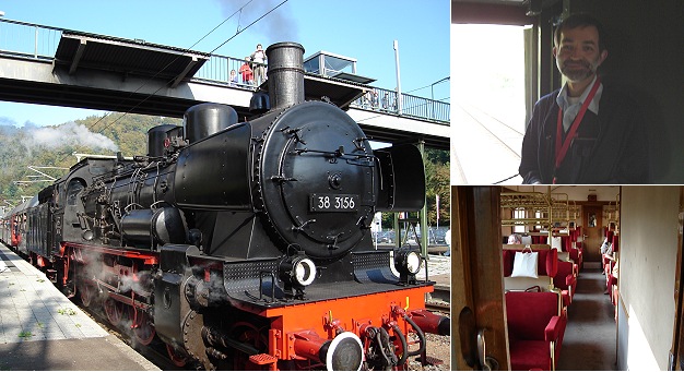 Wir wollen es genau wissen und steigen in Mannheim in den Dampfzug ein. Von weit her klingt schon das durchdringende Signal der Lokomotive, eine preußische P8 der Baureihe 38(10). Imposant der Anblick wie sie einfährt. - Nicht nur Gäste vom Bodensee, aus Japan oder viele Väter mit ihren Kindern genießen in lockerer Atmosphäre die Fahrt mit Stopp in Heidelberg. Überall wird fotografiert. Zugbetreuer Thomas Hohenberger zeigt den Fahrgästen das „Mauseloch“, nämlich wie das Licht bei Einfahrt in den langen Heidelberger Tunnel vom Zugende aus immer kleiner wird. Zeigt den historischen Gepäckwaggon. Und weiter geht es nach Neckargemünd zum Wasseraufnehmen und einer Verschnaufpause. Die Fahrt ist gemütlich, die Sitze der 1. Klasse ungewohnt weich und von draußen winken begeistert die Menschen, staunen über den Triebwagen mit Kohle und die riesige Dampfwolke. Weiter ruckelt die kohlegefeuerte Schnellzugdampflok, hält in Neckarsteinach, in Hirschhorn und stoppt schließlich in Eberbach zur Weiterfahrt nach Heilbronn.
