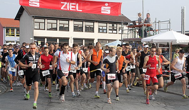 Bei idealen Witterungsbedingungen schickte Bürgermeister Gottfried Görig die 110 Athleten pünktlich um 9.30 Uhr auf die Strecke. Der erste Lauf ging über zwei Runden, die jeweils wieder vorbei an der Wechselzone vor der Oberzenthalle führten. Die Zuschauer konnten somit den Wettkampfverlauf optimal verfolgen. Nach dem Lauf erwartete die Athleten eine knackige Radstrecke über 30 Kilometer. Danach folgte nochmals eine Runde Laufen über 3,5 Kilometer. Bei den Männern entwickelte sich ein spannender Kampf. Rene Hördemann, KSV Baunatal, der diesen Wettkampf bereits einmal gewonnen hatte, lieferte sich von Beginn an einen harten Kampf mit Marc-Phillip Prins aus Limburg und Vladimir Pospichal aus Brno in Tschechien. Nach dem ersten Lauf und dem Radfahren auf der anspruchsvollen Strecke hatte sich Hördemann einen deutlichen Vorsprung erkämpft. Im abschließenden Lauf über 3,5 Kilometer konnte er seinen Vorsprung halten und siegte in einer Zeit von 1:25:54 Stunden mit fast einer Minute Vorsprung vor Prins und Pospichal. Den Streckenrekord verfehlte er dabei nur knapp.