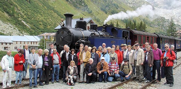 Am folgenden Tag stand die Dampfbahn Furka Bergstrecke auf dem Programm. Ein Verein kümmert sich um den Erhalt der alten Bahnstrecke über den Furkapass und hat dazu vor Jahren die Original-Dampflokomotiven aus Vietnam zurückgeholt. Von Realp aus brachte der Dampfzug die Reisegruppe unter mächtigen Dampfschwaden und hörbaren Anstrengungen zur Bergstation Furka auf 2160 m Höhe. Durch den Scheiteltunnel ging es dann wieder hinunter zur Endstation Gletsch ins Rhonetal. Am Nachmittag stand noch die Besichtigung des Stockalperschlosses in Brig und Zeit zur freien Verfügung auf dem Programm.