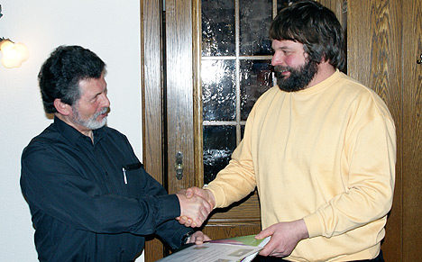 NABU Waldbrunn erinnerte an Peter Edelmann und Dr. Wolfgang Schnetter Gerhard Neureither (li.) ehrte Thomas Edelmann für seine 25-jährige Mitgliedschaft. (Foto: Hofherr)(hof) Die Diskussion um den geplanten Digitalfunkmast auf dem Katzenbuckel beherrschte die Mitgliederversammlung des NABU Waldbrunn, die am Freitag im Gasthaus Drei Lilien in Mülben stattfand.