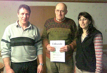 25 Jahre dem Schwimmverein treu geblieben V.l.: Alois Kreutzer (zweiter Vorstand), der Vater von Richard Metzger und Irene Kreß nach dem Überreichen der Urkunde. (Foto: privat)(bro) (mz)Am Freitag, 26. Februar, fand im Gasthaus "Weis" in Mülben die alljährliche Generalversammlung des SV Neptun Waldbrunn statt.