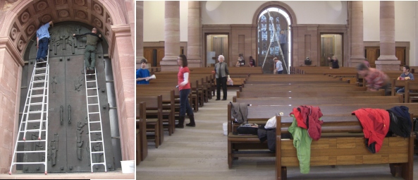 Katholische Kirche in Eberbach auf Hochglanz gebracht (Fotos:privat)(tw) (ps) Am letzten Samstag waren rund 20 Helfer, von jung bis alt, im Einsatz um die Pfarrkirche St. Johannes Nepomuk wieder im österlichen Glanz erstrahlen zu lassen. Es galt, Bänke abzustauben, den Boden zu wischen, Spinnweben zu entfernen, Fenster und Türgläser zu reinigen und vieles mehr. Dabei ging es durchaus auch in luftige Höhe (unser Bild).
