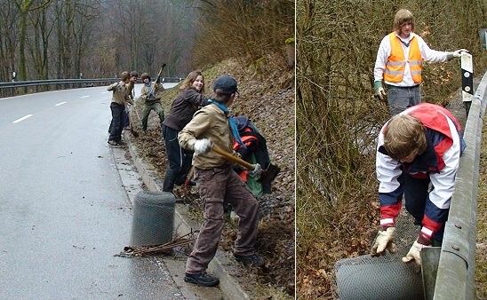 Wenige Tage zuvor konnte auch der Stützpunkt der Straßenmeisterei in Eberbach erst den Schutzzaun im Gammelsbachtal (B45) und die Warn- und Tempobegrenzungsschilder aufstellen. Die Naturschutzbund (NABU) Gruppe Eberbach am Itterstausee und die Eberbacher Ortsgruppe des Bund für Umwelt- und Naturschutz (BUND) im Bereich "Rote Fährt" zwischen Gaimühle und Friedrichsdorf fanden dabei erneut wertvolle Hilfe bei Polizei und THW, bzw. bei der DLRG-Jugend und dem Pfadfinderstamm "Die Goten".