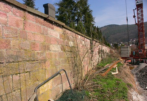 Betonwand statt Sandsteinmauer (Foto: Hubert Richter)(hr) Ein Zwingenberger Bauunternehmen wird zum Angebotspreis von rund 92.000 Euro brutto eine Stützmauer am Eberbacher Friedhof sanieren. Einen entsprechenden Auftrag vergab am Donnerstag der Gemeinderat.